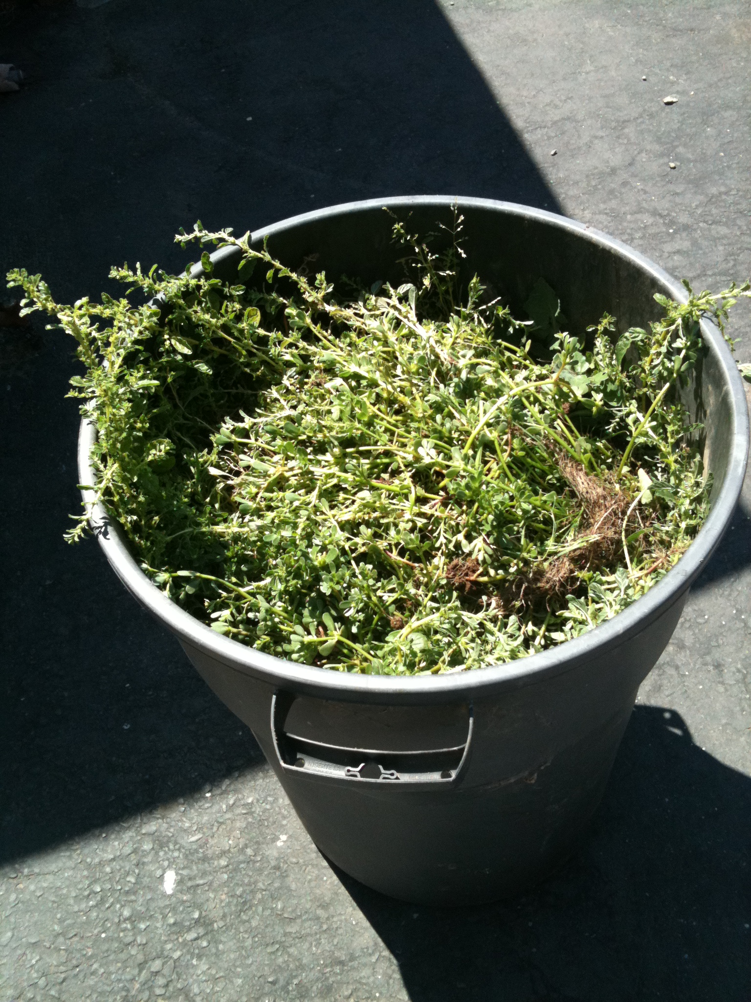 Now, last week when I was out there with Josephine I started weeding the dog pen (because Buddy deserves a beautiful place to sleep too, you know). Have you ever weeded a dog pen that has been neglected for a while? Holy Hell! I didn’t realize what I was in for. First off, I had my spunky little girl with me, as I mentioned before. Josephine was playing quietly in the dirt…picking dirt up, throwing dirt down, picking dirt up, throwing dirt down, Buddy was happily scooting around the yard, and I was decimating some weeds. All of a sudden I smelled a foul stench that I quickly identified as a dead something. I looked around and realized that Buddy was rolling around on top of a decomposing gopher carcass that had maggots (barf, vomit, upchuck, sick) crawling out of it. Real classy, Buddy. Real classy. Josephine, without missing a beat, looked at Buddy and said, “Buddy rolling. Josephine rolling too!” and quickly dropped to the ground. One foot from the maggot (barf, vomit, upchuck, sick) infested gopher. So, so gross. And so I grabbed her, got the heck out of the pen, disposed of the nasty vermin, and tried in vain to spray the dog off/keep him from licking my precious baby with his maggot (barf, vomit, upchuck, sick) mouth. Gross. Needless to say, we watered some tomato plants and hit the road (not before an asshole goat head butted my child, but that is a story for another day). Back to the day at hand. Yesterday, without Josephine, and keenly aware of rotting rodents, I proceeded to spend over two hours weeding the dog pen. I lugged so many weeds out of that pen in a large trashcan, it was amazing. Two trips to the trash trailer in I realized that a half trashcan of weeds may be heavy, but a full can is damn near unmovable. I had to fight the urge to give in and just “come back to it later” (because I have so much time) pretty much the entire time. But with some positive self talk (you can do this Emily!) I got it done.
