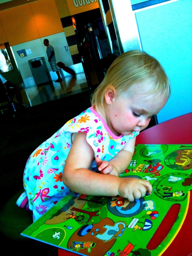 Waiting for our flight and playing with reusable stickers *thanks Rachel and Meyer!*