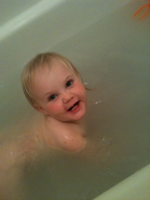 Oatmeal bath to soothe the itch. She looks tortured, I know.