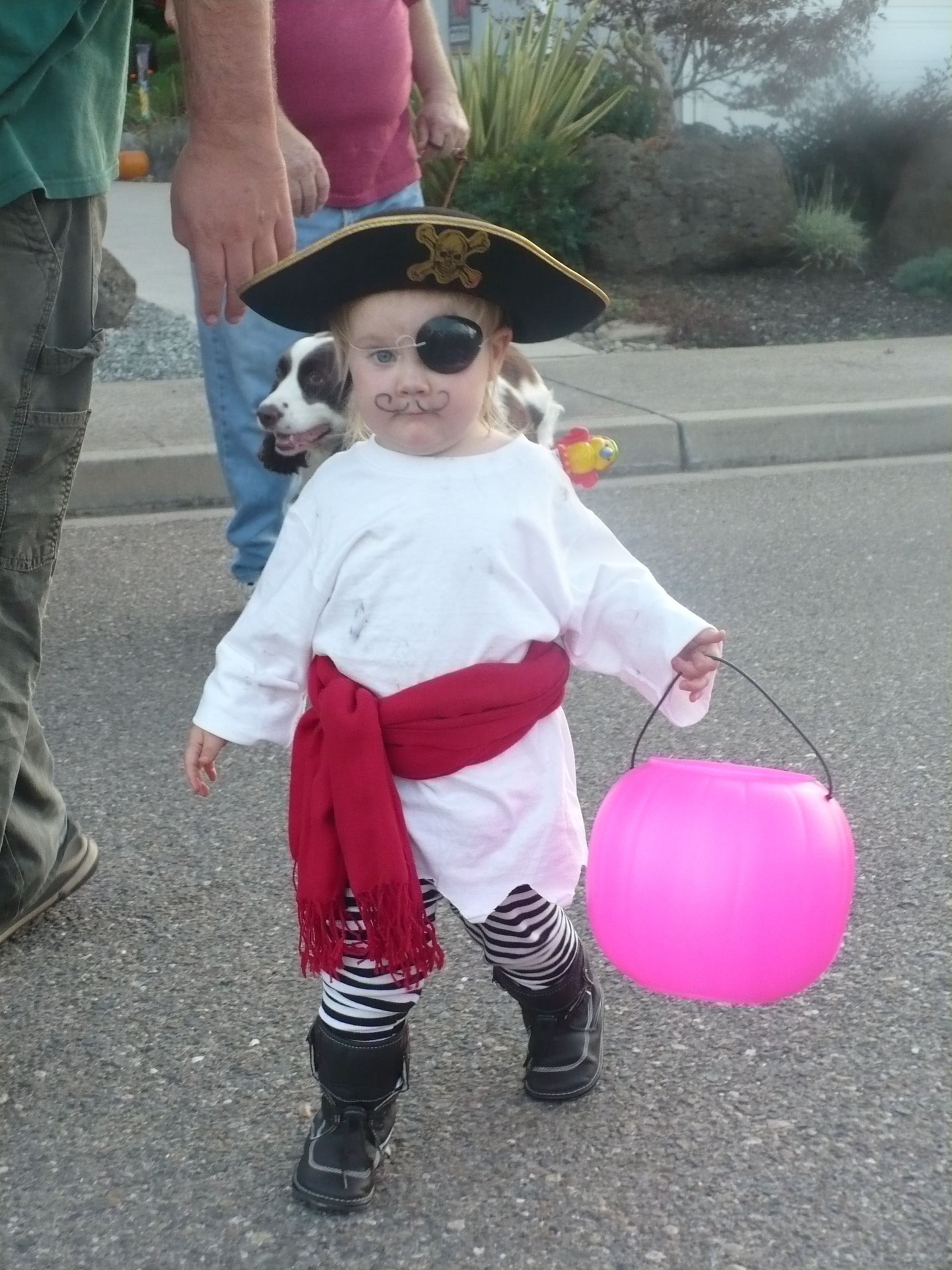 Josephine has been talking about Halloween for about a month and a half (about as long as she has owned the Yo Gabba Gabba Halloween Special DVD, go figure). That entire time she has insisted that she “be a pirate…wear pirate hat, eye patch, ‘n mustache, mama!” My child has big fat opinions. So that is what she be, matey!