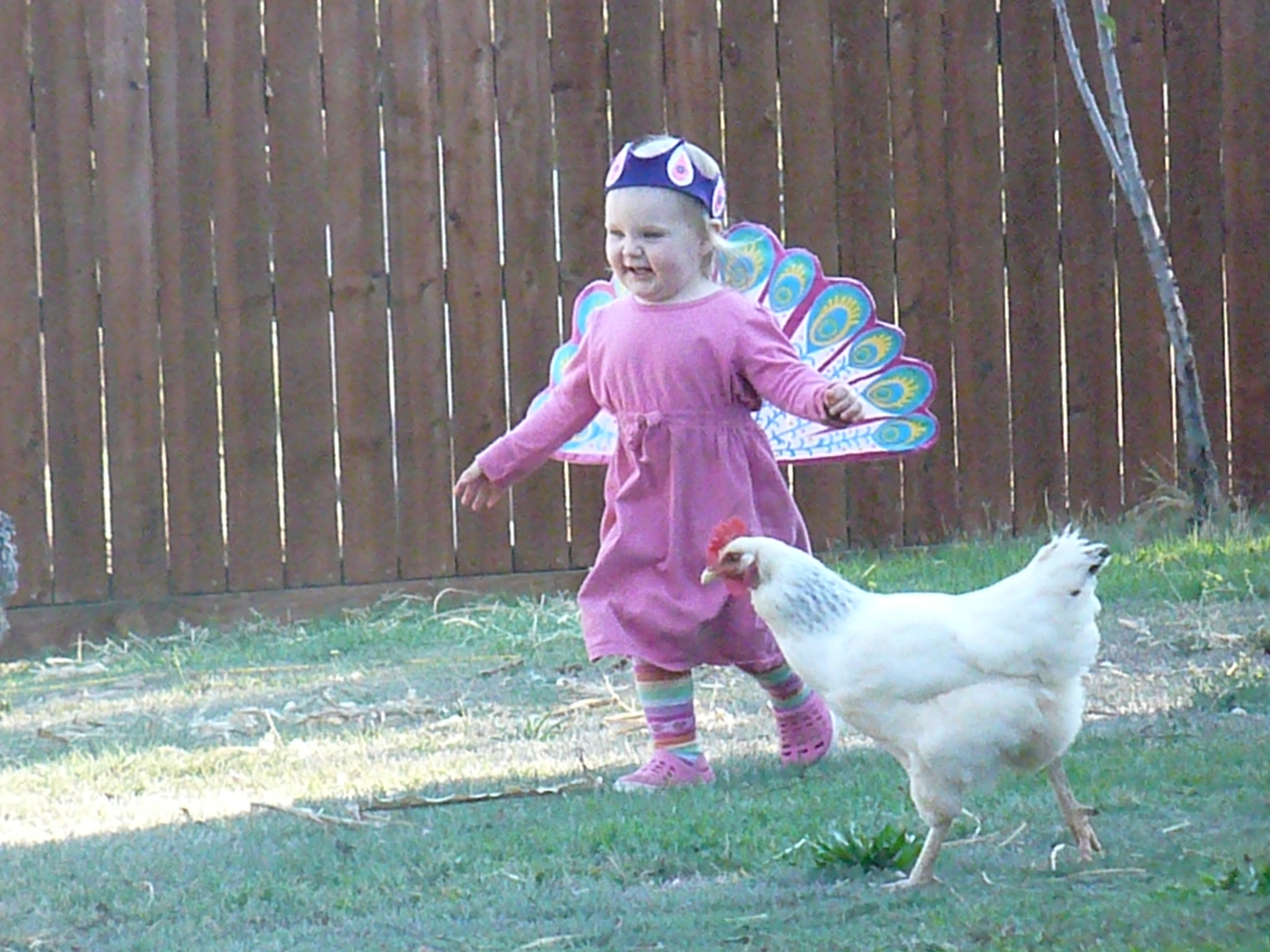 Oh yes, and because I am a slight overachiever (lazy and overachiever, the dichotomy is killing me) I put together a second costume for Josephine to wear to the pre-Halloween festivities we attended this past weekend. I didn’t want her to tire of being a pirate (like that could have happened), and I didn’t want to have to worry about her getting all messy. It was no big deal, since I had bought these peacock wings at the thrift store a while back. I just but some self stick Velcro on a dress to stick the wings on, taped a peacock feather that I had laying around to a wooden rod for a wand, and made a peacock crown out of felt and yarn. I really like the crown. It turned out better than expected. Josephine was not amused. She yelled at me, “I no be peacock, I be pirate!” Whatever. I told you she had big old opinions.