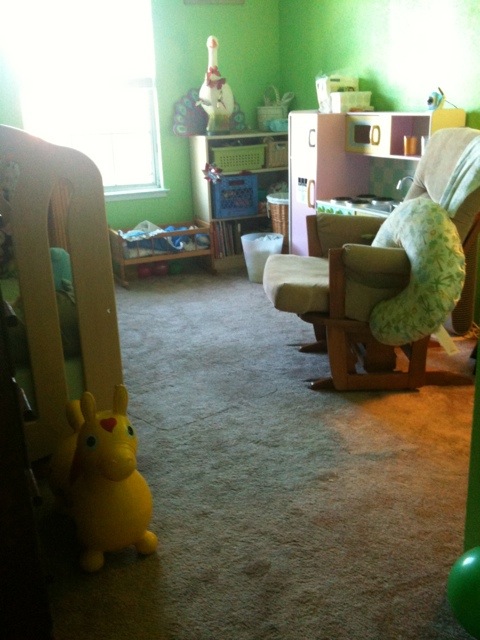 My dad came to visit on his way to Mexico for some dental work and together we moved Josephine’s play kitchen from the living room (where it has been residing since Christmas Eve) into her bedroom. This required moving the changing table out of her room (one step further from a baby, which made me sad) and re-organizing some shelves to put toys away, but it’s done! I forgot how big my living room is without that giant kitchen sitting in front of the fireplace! And I think the kitchen looks nice in Josephine’s room. I hung up some more art, and I think it’s really coming together. Check it out: