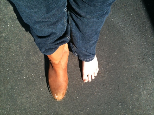 I have been wearing Taylor’s dad’s old size 12 Wolverine work boots so as to protect the bottom of my feet from bruises while I viciously dig up thistles. They are, however, a tad too big for my feet. See: